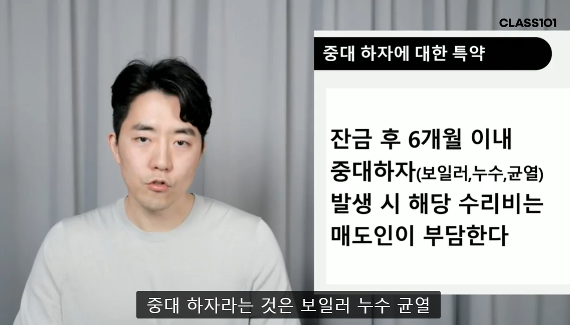-집을 산 뒤에 보일러가 고장난 경우 : 어떤 집주인은 바로 수리비를 보냈지만, 또 다른 경우는 절대 줄 수 없다고 불같이 화를 냈다고 한다. 너무 놀랍게도 수리에 관한 특약이 있음에도 수리비를 무조건 주지는 않는다고 한다. 이 경우 수리비를 제대로 받기 위해서는 소송을 진행해야 하는데 이것이 보통일이 아니다. 결국 소송하는데 들어가는 비용이 수리비랑 맞먹기 때문에 소송을 하는 것이 이득이라고도 볼 수 없는 상황이다. 이걸 들으면서 매도인 잘 만나는 것도 참 복이라는 생각이 들었다.