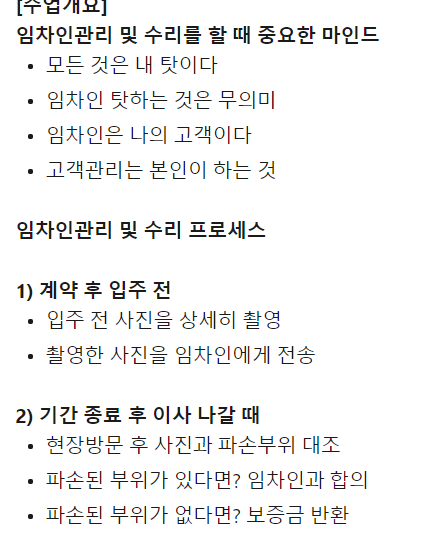 강의 중에 해주셨던 말씀 중에 인상 깊었던 말이 '사람들이 렌트카를 몰 때 조심해서 운전한다. 혹시 차량에 문제가 생기면 렌트카 회사에 비용을 지불해야 하는 것을 알기 때문이다. 따라서 집 주인도 파손된 부분에 대해서 얼마든지 비용을 청구할 수 있다는 것을 사전에 반드시 공지하여 임차인이 알도록 해야 한다' 는 것이었다.